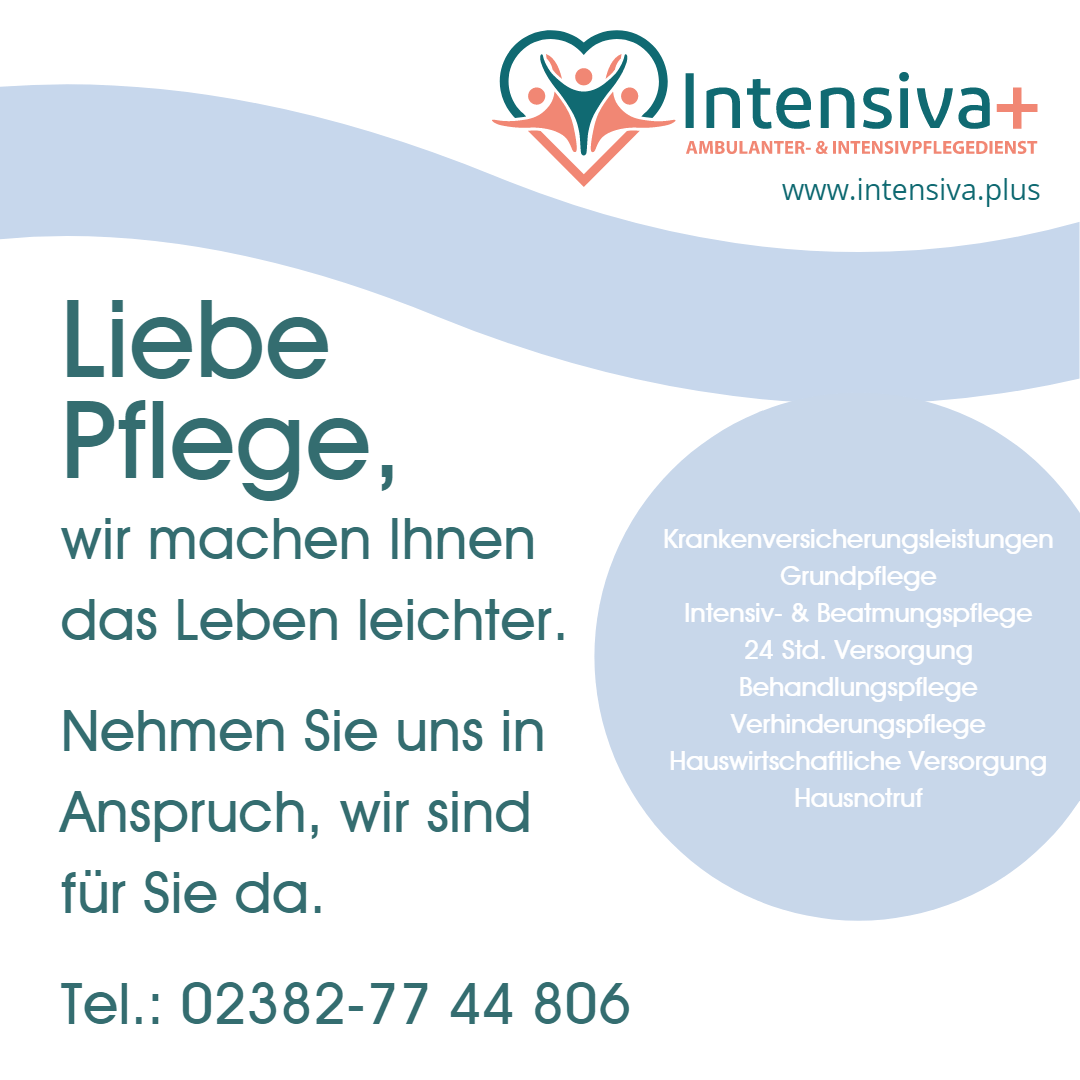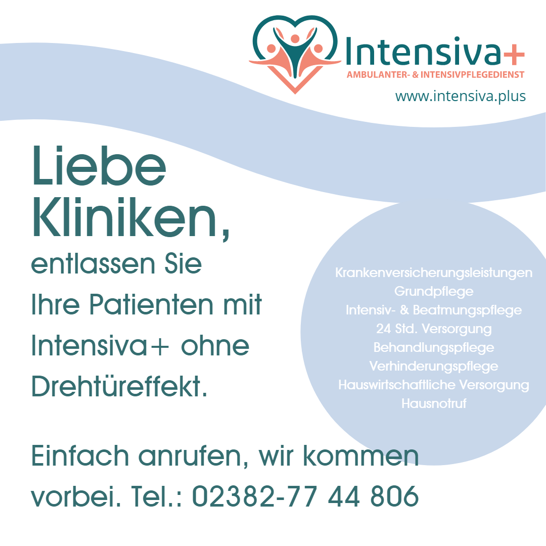 Intensiva+ ist spezialisiert für außerklinische Intensiv- und Beatmungspflege. Mit Standorten in Ahlen und Dortmund versorgen wir Patientinnen und Patienten in ganz Nordrhein-Westfalen – kompetent, zuverlässig und rund um die Uhr.